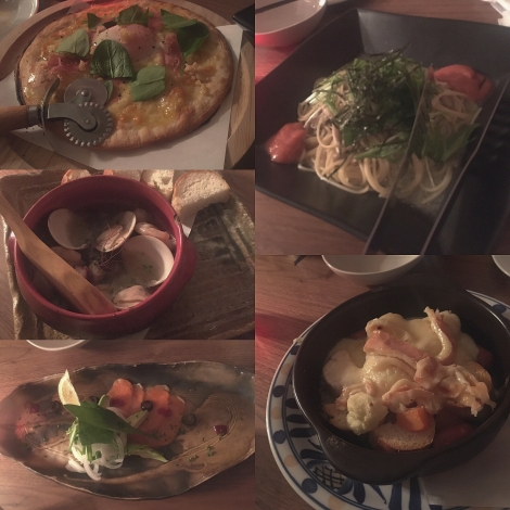 海鮮のアヒージョ、明太子豆腐グラタン、パスタ、ピザ❤︎