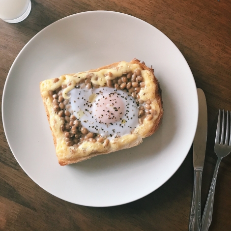 フランス食パンにマヨネーズと納豆と卵とオリーブオイルを乗せた、ラピュタパンってやつです!