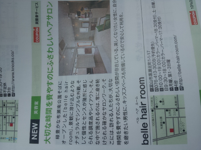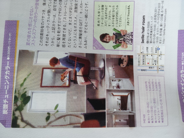 TJとやま8月号&富山情報7/25号 掲載★ TJとやま8月号の new openコーナーに belle hair room掲載しました!! ご新規の方に限り TJ見たよでクーポンついてます★ ・ ・ ・ そして本日配布富山情報7/25号 夏のオススメ掲載しました♪ お店の内容盛りだくさんです!! belle hair room…